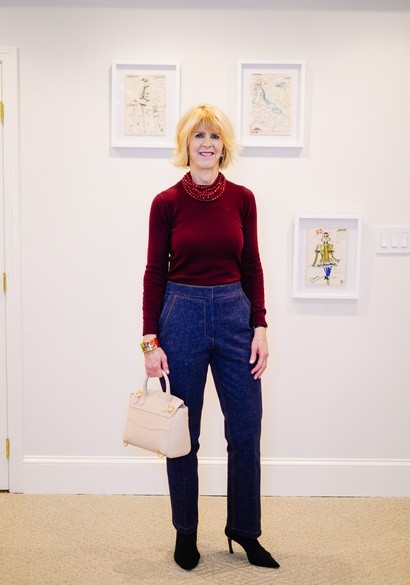The burgundy crewneck goes effortlessly with my jeans and can also be worn with all the other pieces in my capsule. The beige handbag adds an element of professionalism.