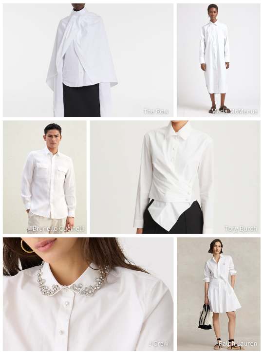 This year, there is a wide array of white collared shirts that are anything but uniform, yet they still have utility in any wardrobe. A century ago, the white shirt symbolized a pristine appearance. The “Oxford” shirt with an essential and basic status came next, as a wardrobe item that easily paired with more trendy pieces.